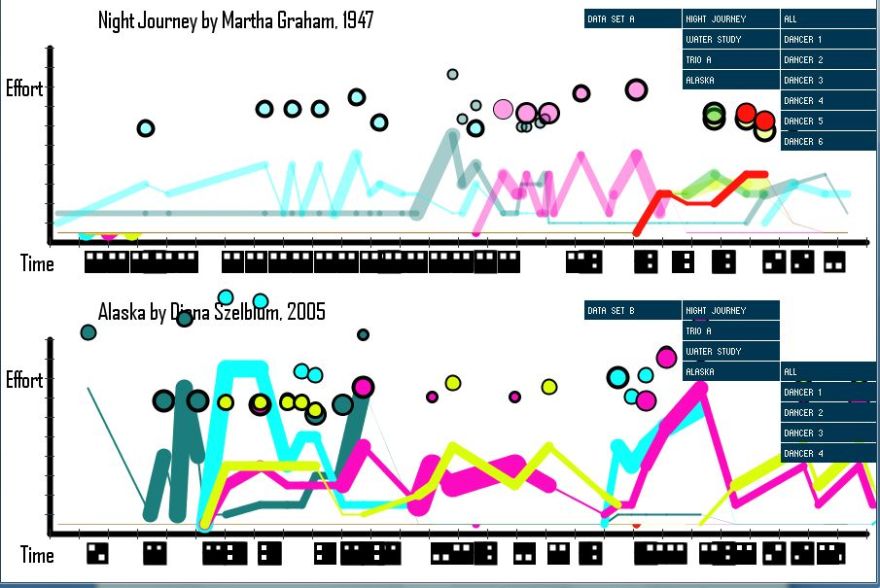 Contemporary dance is an experiential and time based art form with few available analysis techniques. Our design facilitates structural analysis of dance performance by codifying and plotting expert viewer information. ActionPlot is then useful to experts familiar with choreographic strategies and illustrates three levels; viewing for interpretation or meaning, for structural or performative information or for detailed movement information. Plotted elements include the number of performers, the performer’s attention and intention, the amount of effort used, tempo of the effort, the balance of the movement within the body and the time the action is performed. This process conveys information about the viewing experience in context, allowing the user to see structural and performative patterns, similarities and differences while comparing between two works. We detail our motivation, design decisions, implementation and a qualitative evaluation for the presented system.